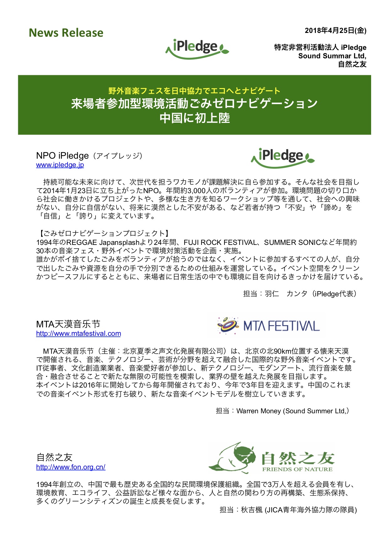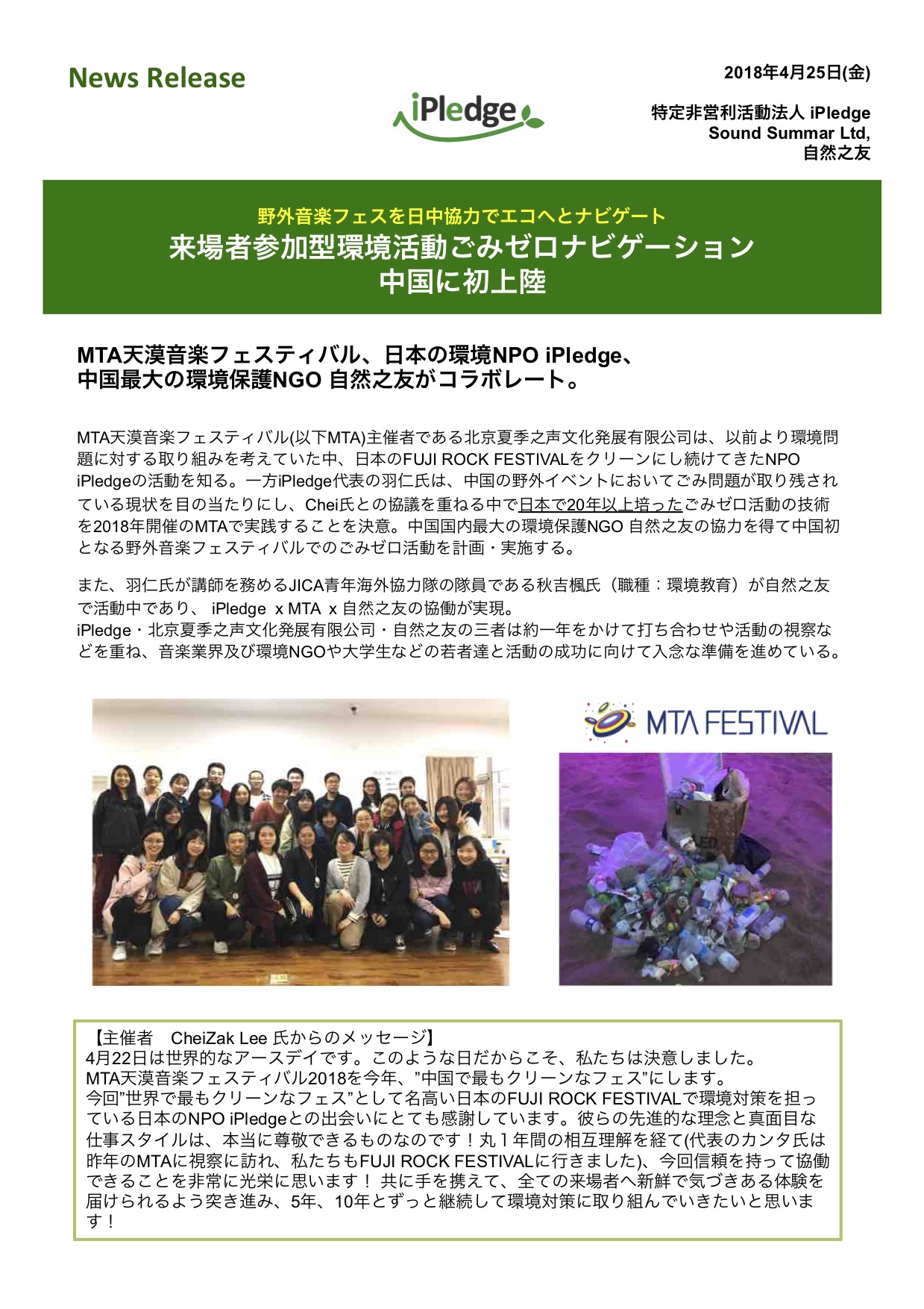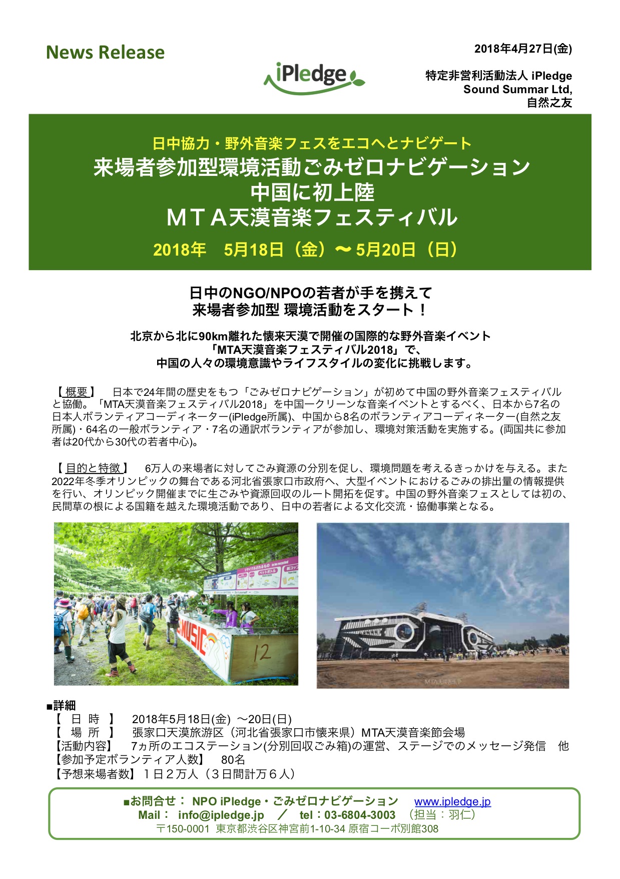 MTA天漠音楽フェスティバル、日本の環境NPO iPledge、